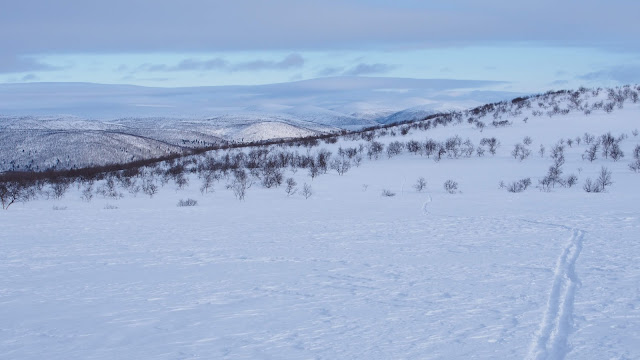 Aamupäivällä suksin ylös tunturiin. Sää ei ollut paras mahdollinen, joten en ottanut keitintä mukaan vaan kävin ihan vain hiihtelemässä ja tutkimassa lumitilannetta. Loppupäivä menikin saunaa ja mökkiä lämmittäessä ja lumia sulatellessa. Ja saunoessa tietenkin myös.
